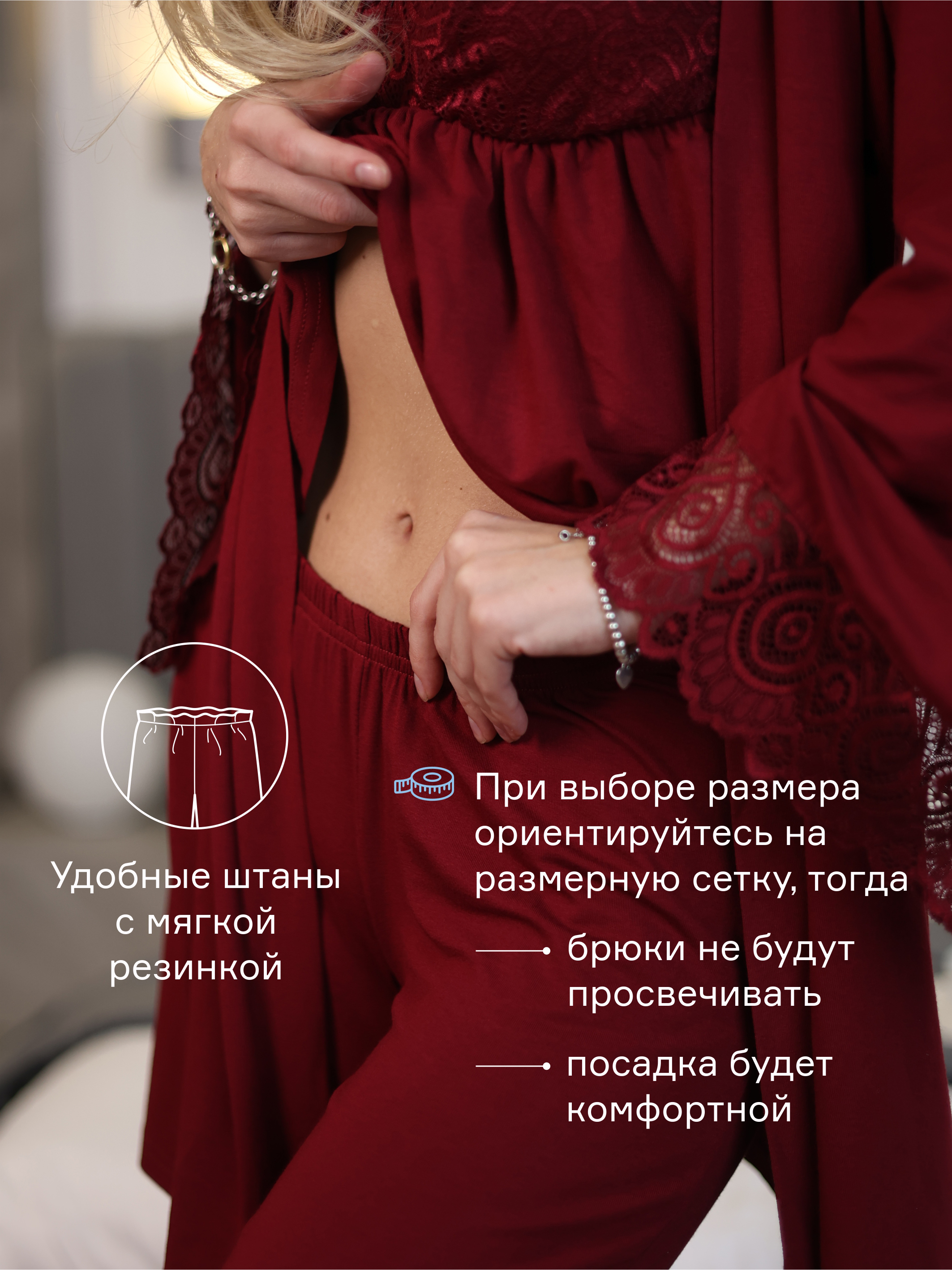 Нежный и эластичный комплект тройка от Optmix для беременных и кормящих иготовлен из турецкой вискозы, которая была выбрана специально для нежной кожи беременных и кормящих, что бы не вызвать раздражение . Удобен в носке, легкий доступ при кормлении. Штанишки с майкой созданы, учитывая растущий животик. Идеально подходит для дома и сна.1. Халат:- Длина по спинке - 72см- Длина рукава - 55см- Ширина рукава - 27см1. Майка:- Длина по спинке - 46см1. Брюки:- Длина по боковому шву - 106см- ширина по низу - 22см Если Вы ищите: домашняя одежда для женщин, бюстгальтер для кормления, одежда в роддом, одежда для беременных, бюстгалтер женские, пижама женская, пижама для будущих мам, пижама большие размеры, комплект в роддом, сорочка с халатом для беременных, костюм для беременных, пижама для беременных и кормящих, костюм кормящих, комплект халат и сорочка в роддом, сумка в роддом, собираемся в роддом, пижама больших размеров, то наш костюм для беременных и кормящих мам идеально Вам подойдет.