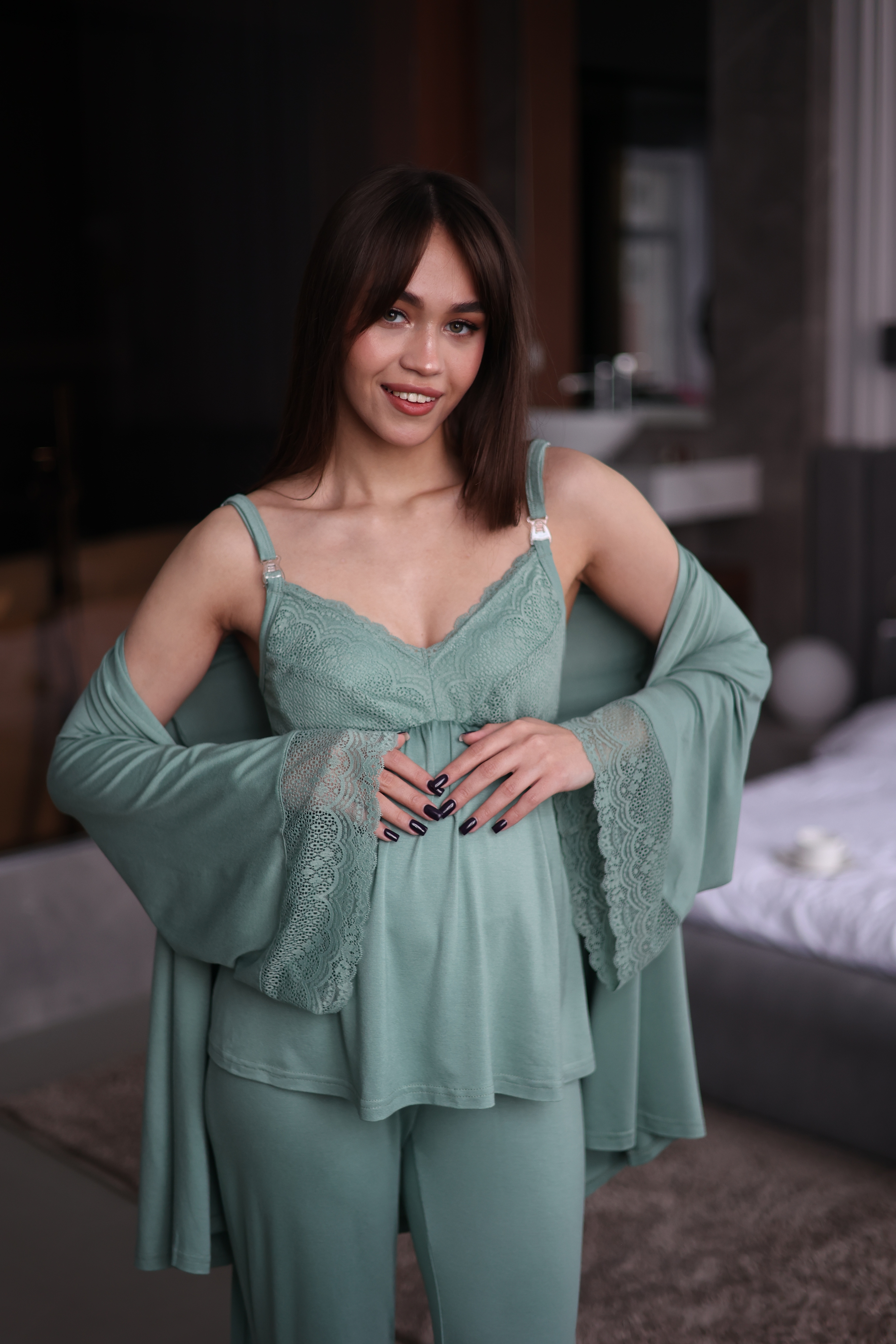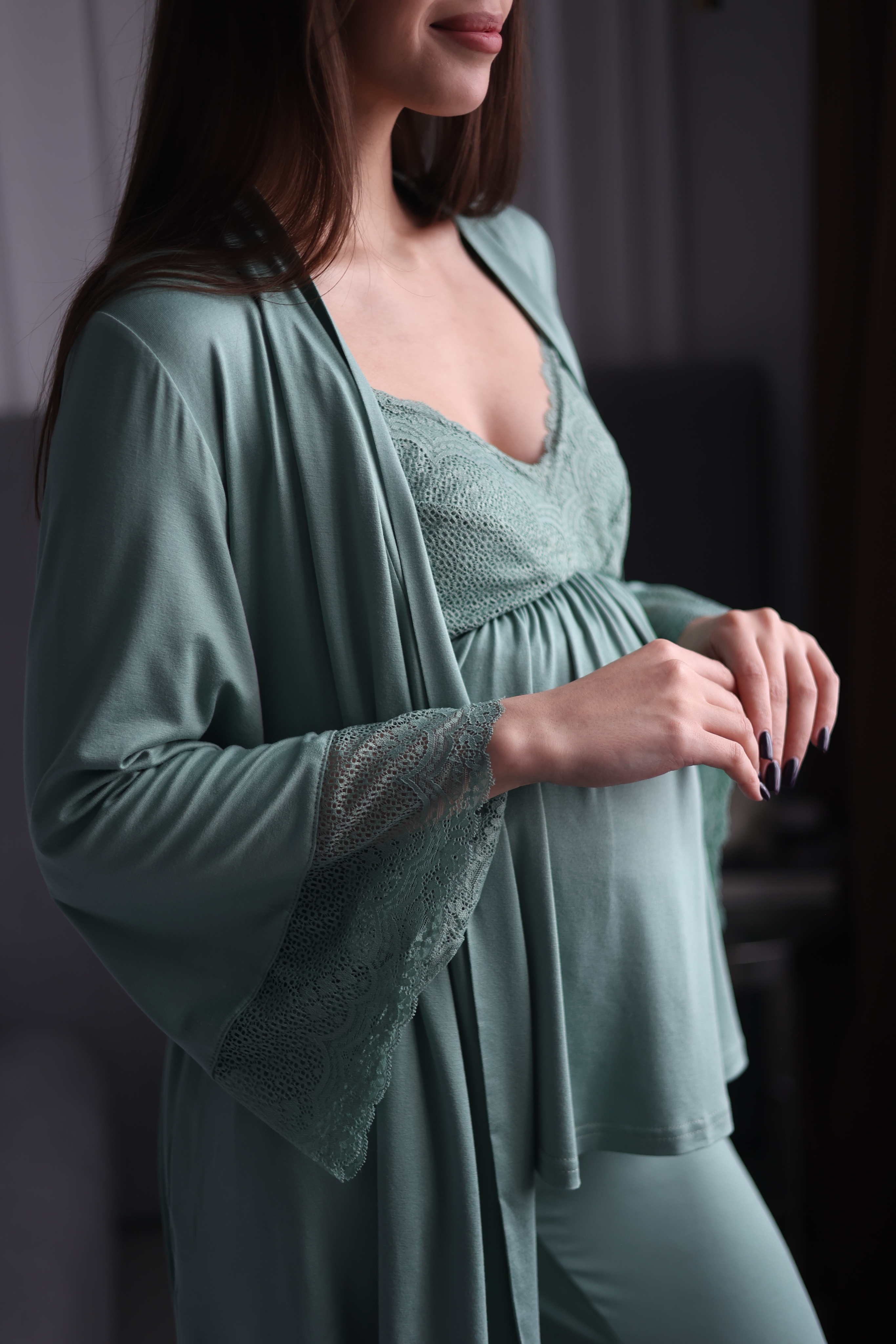 Нежный и эластичный комплект тройка от Optmix для беременных и кормящих иготовлен из турецкой вискозы, которая была выбрана специально для нежной кожи беременных и кормящих, что бы не вызвать раздражение . Удобен в носке, легкий доступ при кормлении. Штанишки с майкой созданы, учитывая растущий животик. Идеально подходит для дома и сна.1. Халат:- Длина по спинке - 72см- Длина рукава - 55см- Ширина рукава - 27см1. Майка:- Длина по спинке - 46см1. Брюки:- Длина по боковому шву - 106см- ширина по низу - 22см Если Вы ищите: домашняя одежда для женщин, бюстгальтер для кормления, одежда в роддом, одежда для беременных, бюстгалтер женские, пижама женская, пижама для будущих мам, пижама большие размеры, комплект в роддом, сорочка с халатом для беременных, костюм для беременных, пижама для беременных и кормящих, костюм кормящих, комплект халат и сорочка в роддом, сумка в роддом, собираемся в роддом, пижама больших размеров, то наш костюм для беременных и кормящих мам идеально Вам подойдет.